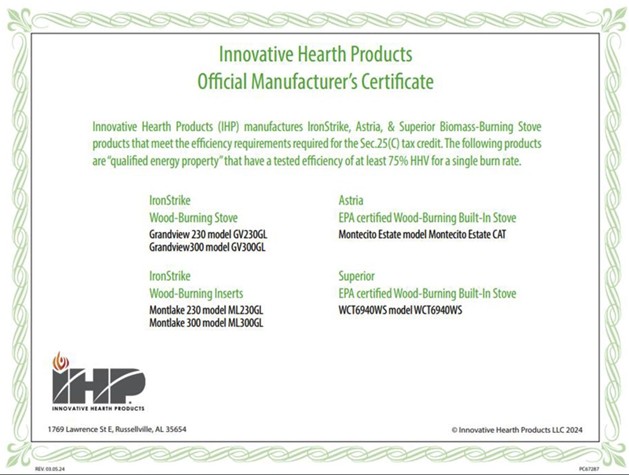 • Tax paying consumers can submit for this tax credit under Section 25(C) of the Internal Revenue Code (“IRC” or “tax code”). They will need a copy of the invoice for the product purchase and installation (venting, floor protection, and labor) costs, and the manufacturer’s certificate showing the qualifying wood or pellet product.